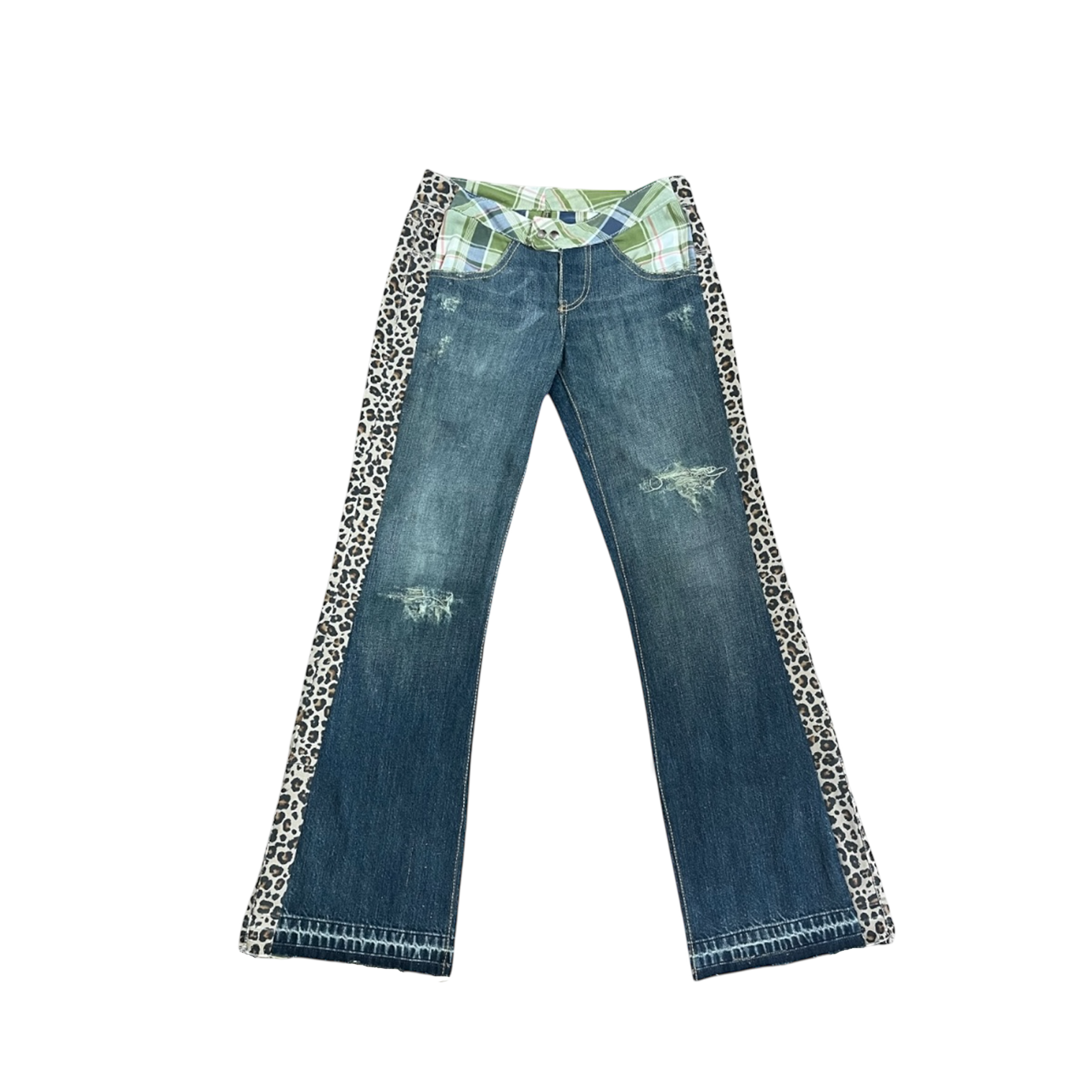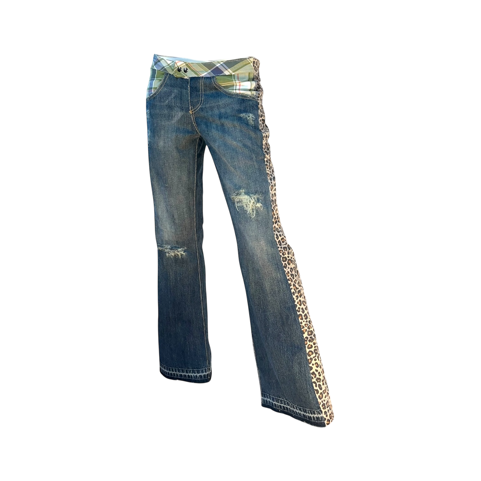 Blue Dirty Wash Plaid Leopard Hybrid Jeans